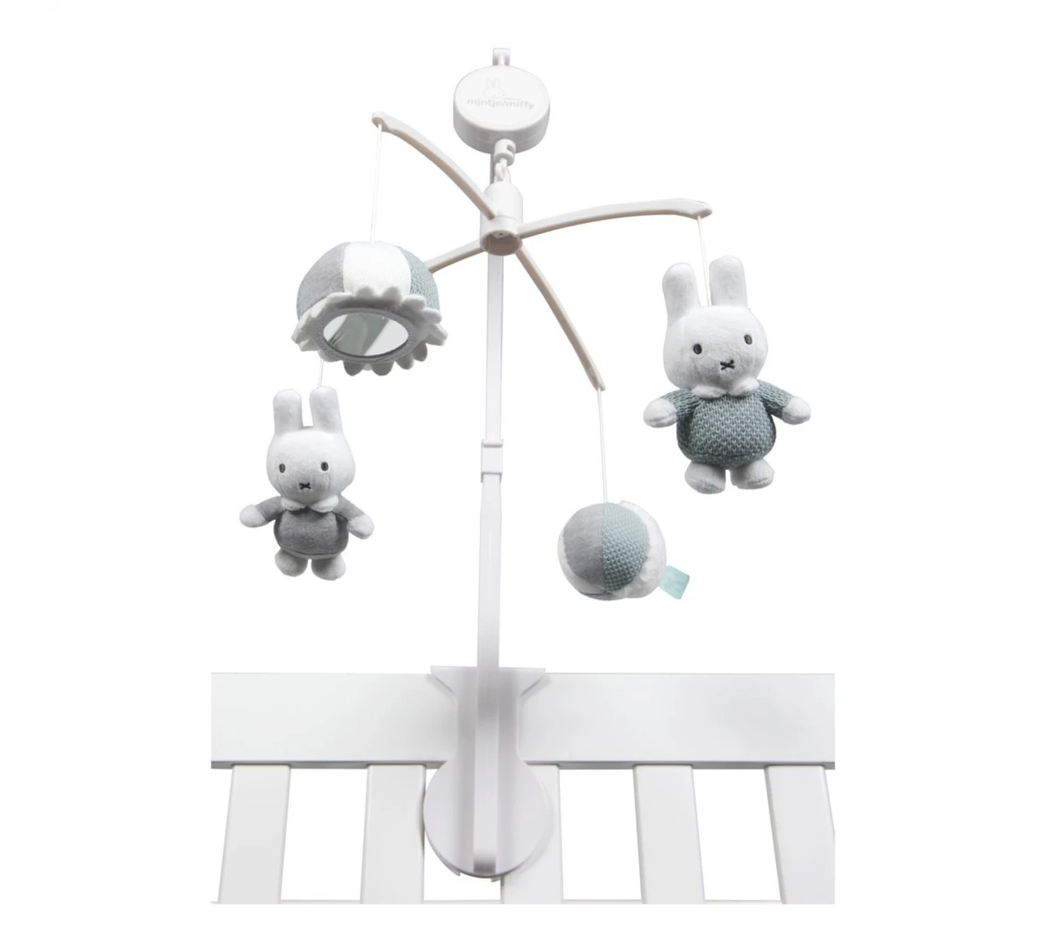 De muziekmobiel van Nijntje is eenvoudig te bevestigen aan de box. Het heeft ÊÊn melodie: Brahms Lullaby. Aan de mobiel hangen vier speeltjes: twee konijntjes, een balletje en een spiegel. Een muziekmobiel werkt rustgevend voor de baby en leert je kleintje om te leren kijken en te volgen.
